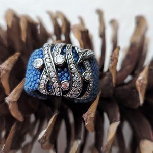 Blue Stingray Leather, Oxidized Sterling Silver, and White Topaz Adjustable Ring