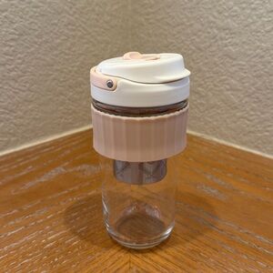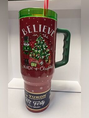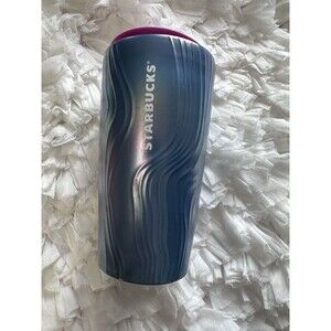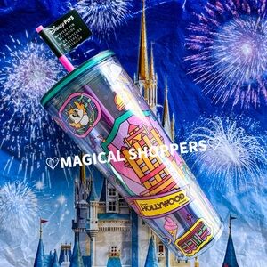 Stanley tumbler featuring a playful Stitch design. Includes a handle and straw. Vibrant blue color.