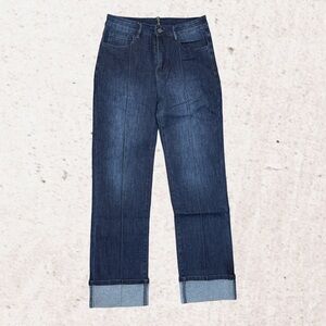These blue straight leg pants feature a classic indigo hue and a stylish cuffed hem, offering a timeless and versatile look. The medium wash adds a slightly worn-in appearance, perfect for casual outings or relaxed settings. Crafted from quality denim, they provide comfort and durability for everyday wear.