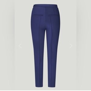These blue straight leg pants feature a sleek design with sharp vertical creases for a formal look. The smooth fabric and full-length cut make them a versatile addition to any wardrobe.