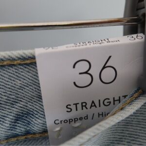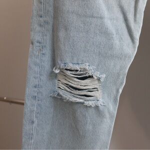 These blue straight-leg jeans feature a modern distressed design with intentional rips at the knees, offering a casual and trendy look. The light wash denim provides a worn-in appearance, perfect for everyday wear. MNG. NWT.