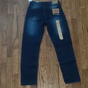 These blue jeans feature a classic straight-leg cut with a modern distressed wash, offering a stylish and casual look. The rich indigo tones and natural fading create a dynamic appearance, perfect for everyday wear. Crafted from medium-heavy weight denim, they provide both durability and comfort.