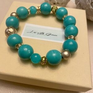 Blue Stretch Quartz Bracelet 14mm and 8mm quartz beads, gold details, turquoise