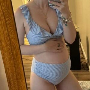 Enjoy the sun in this stylish blue striped bikini with ruffle details. Perfect for a chic beach look.