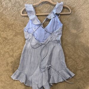 Chic blue striped romper with ruffle details. Perfect for a stylish look.