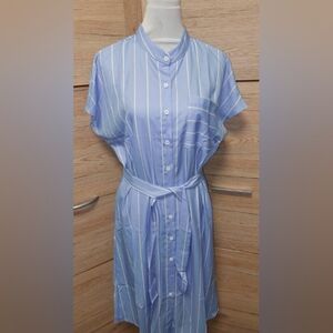 Elegant blue striped shirt dress with a flattering tie waist. Perfect for any occasion.