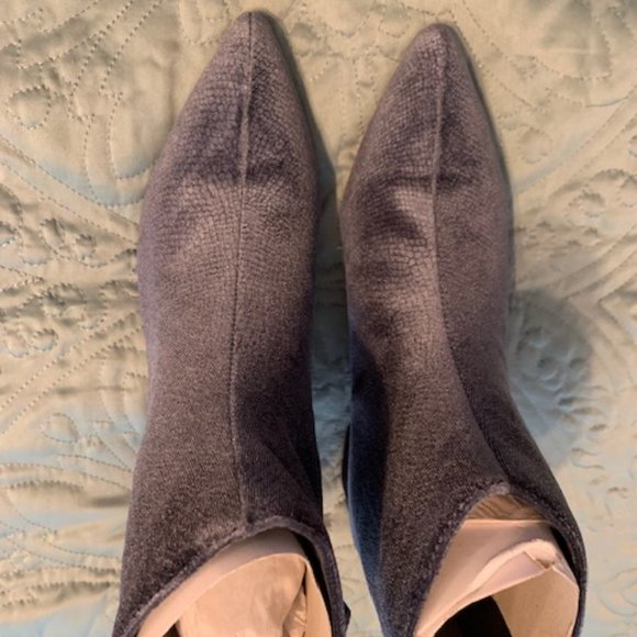 Light blue suede ankle boots Size 8. Boots have side zippers and 2" heels. Pointed toes. Brand new and never worn. Color looks dark in the picture, but it is actually light to medium blue.