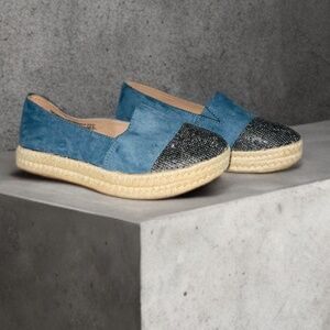 Stylish and super comfy — these blue suede espadrilles are perfect for everyday wear! Featuring a chic black glitter cap toe and woven jute sole, they blend casual comfort with a touch of sparkle. The soft suede material feels great on the feet, and the slip-on design makes them easy to wear on the go.