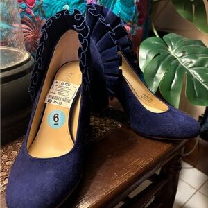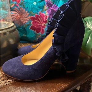 Elegant blue suede heels with ruffle detail. Perfect for any occasion.