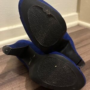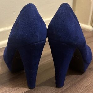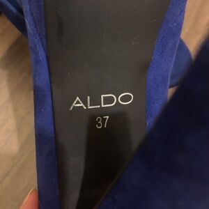 Aldo, royal blue, suede, peep toe heels. I have worn these to plenty of events but they can be hard to style being blue. Relatively comfortable for high heels. They are in good condition other than the one area of the tread on the left shoe.