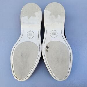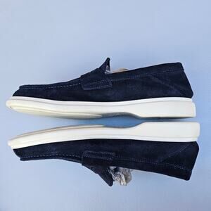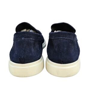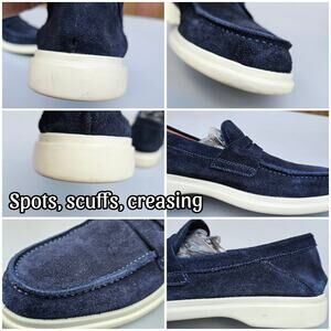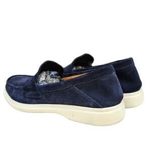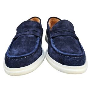 Navy blue sueded leather upper, round toe, penny loafer styled vamp. Slip on style, leather lined. White rubber sole w/ low heel. Issues noted in photos. Very good preowned condition, overall. Size 8.5M by George Brown Bilt. Style: Foster Penny Loafer.