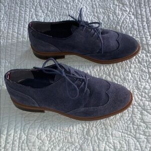 These blue suede wingtip oxfords feature a classic design with decorative broguing and a sleek silhouette. The traditional lace-up closure ensures a secure fit, while the light-colored sole adds a touch of contrast to the deep navy upper. Perfect for adding a sophisticated touch to any outfit.