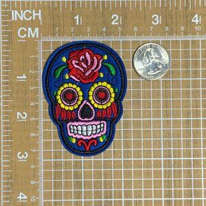 Blue Sugar Skull Iron on Patch Embroidered Rose Floral Day of the Dead Small