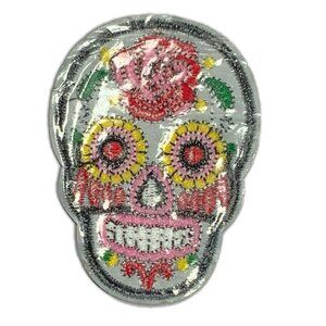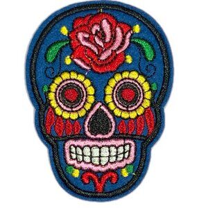 Beautiful, smaller size, sugar skull iron on patch featuring a rose with floral design in multi color (Red, Pink, Green, White, Black, Yellow) embroidery on a blue base.