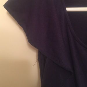 Navy blue mid length summer dress with flowy cap sleeves and fitted waist.