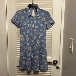 Step into summer with this adorable blue mini dress, adorned with a playful daisy print! Perfect for warm days, this dress features a breezy silhouette that's both comfortable and flattering. The soft fabric and cheerful design make it an ideal choice for picnics, beach outings, or casual get-togethers. Pair it with sandals or sneakers for an effortlessly cute look!