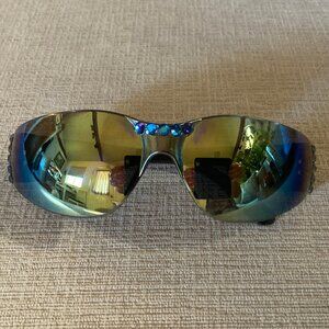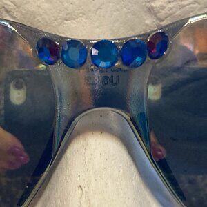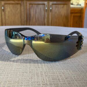 Selling these unique gold and blue mirror biker-style sunglasses with authentic blue iridescent Swarovski crystals. 5 crystals on the bridge of the nose, 5 crystals on the left, and 5 crystals on the right. Nice fit and they look good on everyone. Glasses and frames are plastic and durable. Never worn. Perfect for festivals, beach, concerts or everyday when you don't want to risk losing your more expensive shades.
