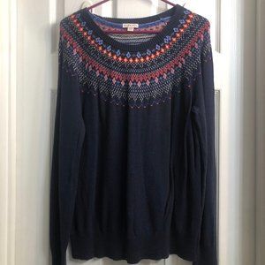 Dark blue sweater with geometric pattern along the collar in orange, red, white, and other colors.