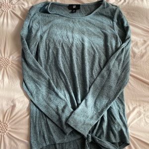First one- is a blue IZ sweater with hints of grey in it. It is heavier but made out of a very soft material. It is also knotted in the front. Is an Xsmall but fits like a small.