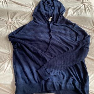 Second one- is a navy blue very light sweater with a hood. This sweater is also cropped. It has almost a waffle pattern in it. Is a small and fits true to size