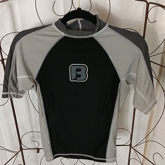 Black and gray rash guard. Short sleeve with high neck to protect you while surfing.