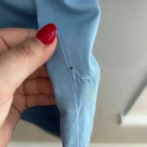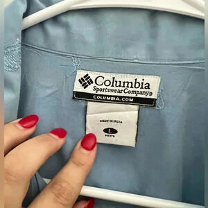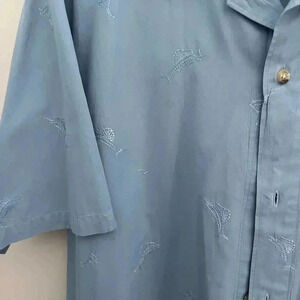 Blue Swordfish embroidered Columbia short sleeve button up. It has one small spot on on the side inseam