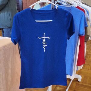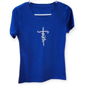 Stylish blue t-shirt featuring a 'faith' graphic in white.