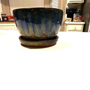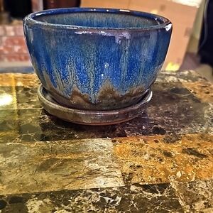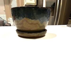 Blue & Tan Ceramic Planter With Saucer and Drainage Holes Preowned 6"x6"x4"