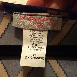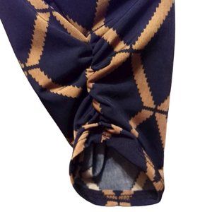 Blue and tan/khaki hi-lo tunic has a pretty diamond-shape print and ruched sleeves at lower section. Size 1X - Ignore the tag, it runs smaller - see measurements below.