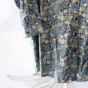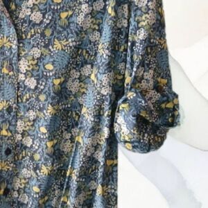 Beautiful woman's long button-up top. A floral pattern of blues, tans, and white.