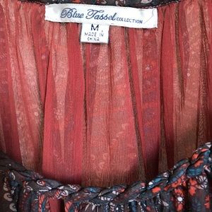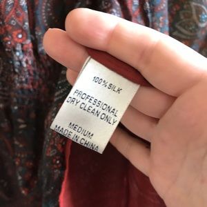 100% silk top from Anthropologie with lots of nice details like rope pattern at scoop neckline, keyhole, sheer elastic-gathered 3/4 sleeves, gathering at waist for flattering fit that then flares out to become a long shirt. Great for a more self-conscious day when you still want to feel gorgeous. The color is a rich brick/plum, orange, and teal. Great used condition, only worn twice!