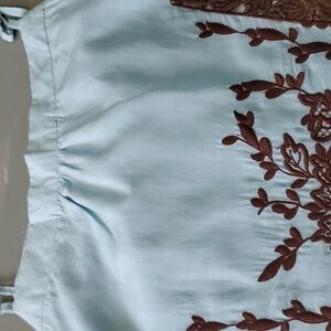 This top is so lovely, adjustable straps. Completely lined. Beautiful shade of blue. Size XS, 30% silk, 70% cotton. hand wash. Pit to pit flat measurement is 16". Top to bottom length is 16.5 ". Consider making a bundle and get an even better offer.