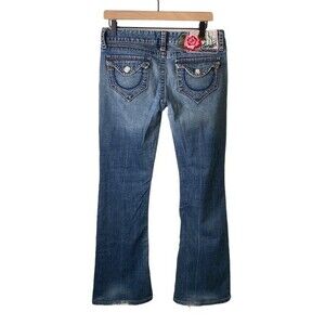 Blue Tattoo Low Rise Bootcut Distressed Jeans Big Stitch Embroidered Rose Logo