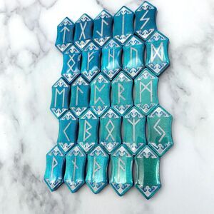 These stunning runes are made of resin and acrylic paint, and they feature a mesmerizing blue purple chrome finish. Each rune measures 1.25 x .75 inches, and the set includes all 25 runes of the Elder Futhark alphabet.