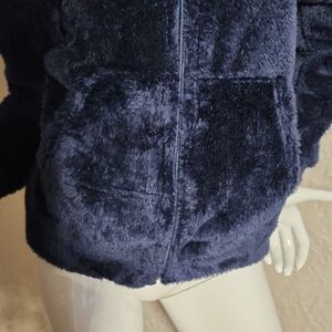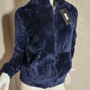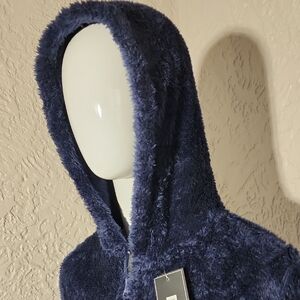 Experience ultimate comfort and warmth with this plush blue teddy jacket, featuring a cozy hood and convenient front zipper closure. Its soft, fuzzy texture makes it perfect for cooler weather, offering a stylish and versatile look.