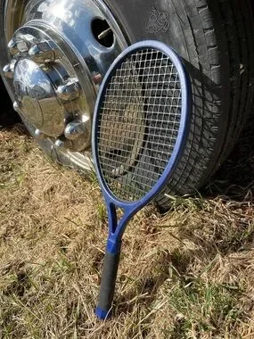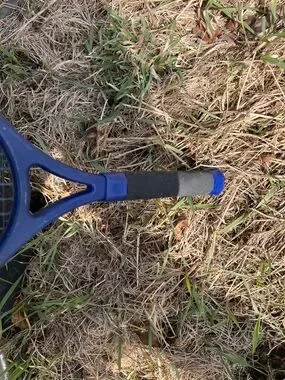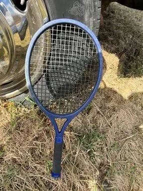Lightweight tennis racket. Blue frame with black strings and grip. Comfortable foam handle.