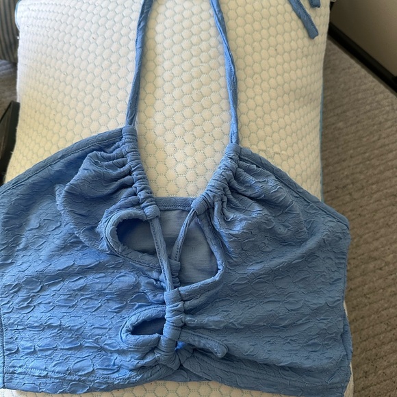Stylish blue halter top with a textured design. Features a unique front tie detail.