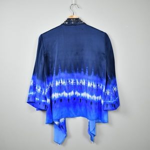 Black Label by Chico's Blue Tie Dye Beaded Kimono Cover up Cardigan 100% Silk
