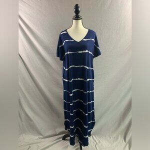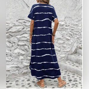 Blue Tie Dye Striped Curved Hem Tee Dress With Pockets