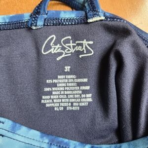 City Streets 82% polyester / 18% elastane bright royal blue and light blue tie-dye print pull on racerback halter top with ruffle detail bottom, EUC. Comes with matching pull on bikini bottoms, 3T, VGUC**light pilling to bottoms.