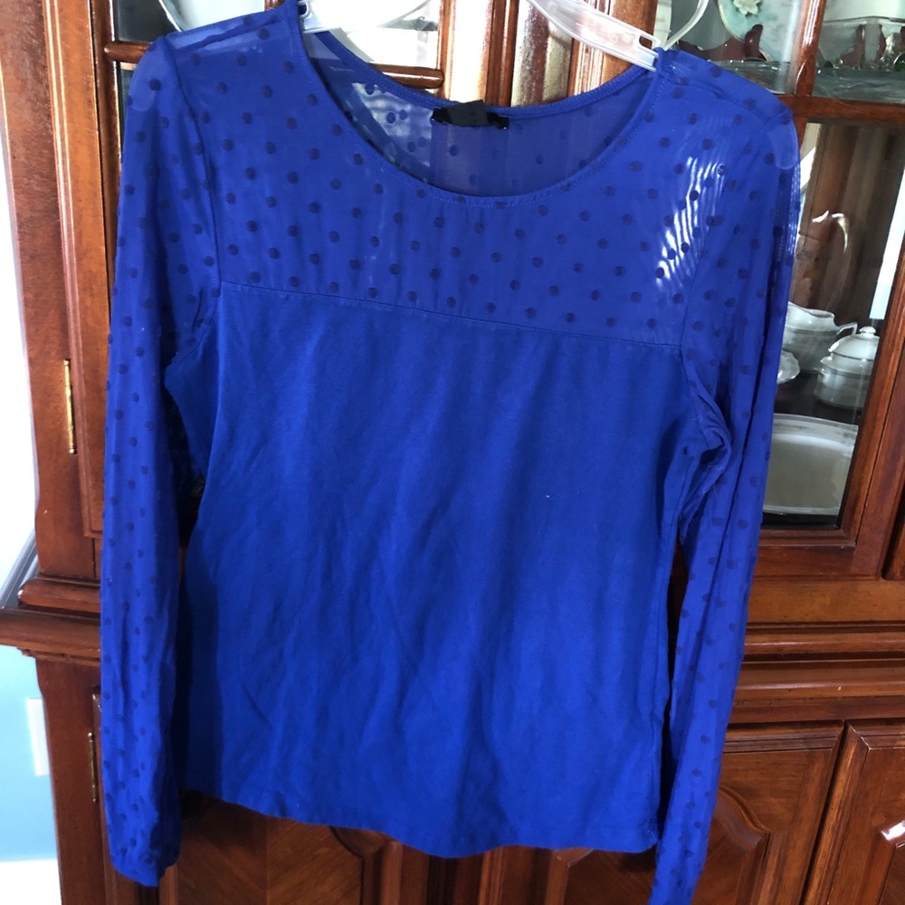 Long sleeve blue shirt with mesh neckline and sleeves