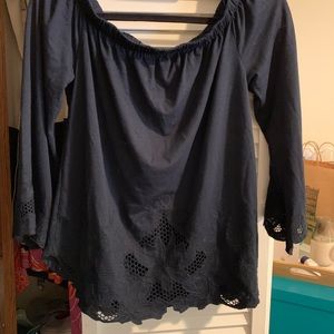 Detailed sleeves and bottom of shirt. Navy blue. Can be worn off the shoulder or not, looks good both ways!