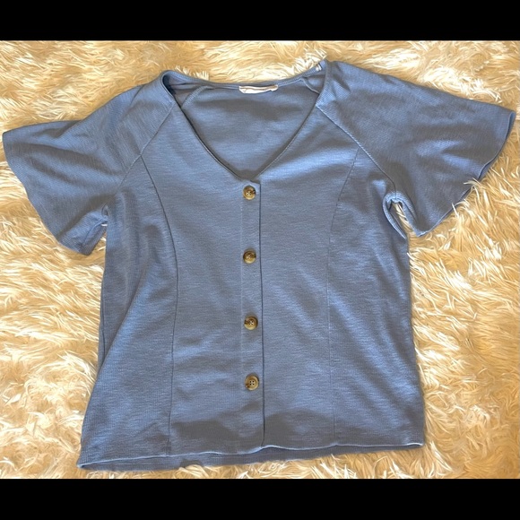 Light blue top with buttons up the middle (NOT a button up top, just for show) and flared sleeves. Fits me a little bit cropped and not quite a full length top. May possibly be less or more of a cropped style depending on body type.