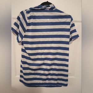 Blue 2-in-1 top. solid Blue top with striped cardigan over top that is blue and white striped.