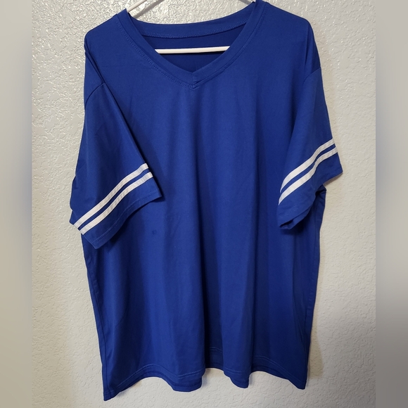 Casual blue V-neck t-shirt. Features white stripes on sleeves. Perfect for everyday wear.
