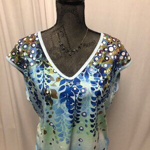 Blue Top Womens XXL Butterflies Pretty Design V-Neck Short Sleeve