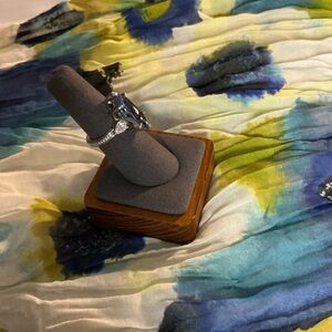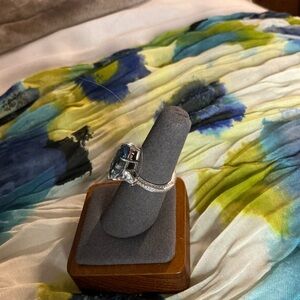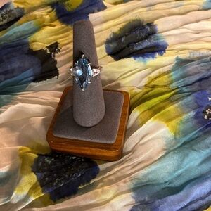This marquee cut blue gemstone, possibly aquamarine or blue topaz is set in 925 Sterling silver. The central stone is flanked by two smaller accent stones on each side, enhancing the brilliance and elegance of the design. The band includes delegate pave’ set stones along the shank, adding further sparkle. This ring is approximately five carrots.