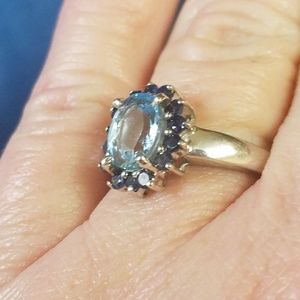 Beautiful sterling silver ring featuring a gorgeous oval blue topaz with round sapphires surrounding the Center Stone. This ring is a size 7 and would look fabulous with any outfit you would decide to wear it with! For more information, please text me.