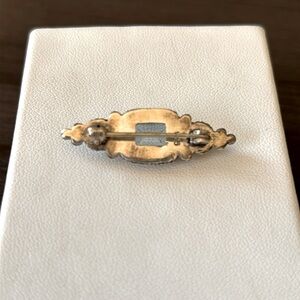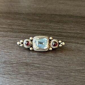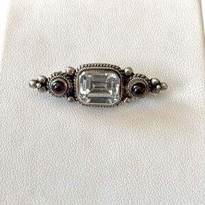 Gorgeous rectangle Blue Topaz and two cabachon Garnet accents on a sterling silver pin. Measures 1 3/8” x 3/8” (45mmx10mm).