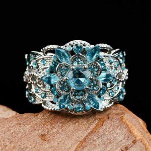 🌸 Blue Turquoise Aquamarine Hollow Cabochon Cocktail Ring